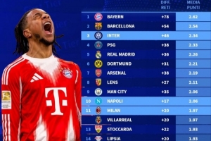 体育资讯4月15日讯 德国转会市场盘点了欧洲五大联赛各球队净胜球和场均积分情况,具体如下: